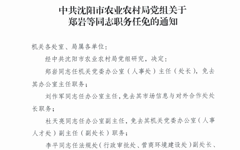 中共沈阳市农业农村局党组关于郑岩等同志职务任免的通知