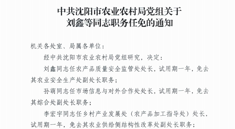 中共沈阳市农业农村局党组关于刘鑫等同志职务任免的通知