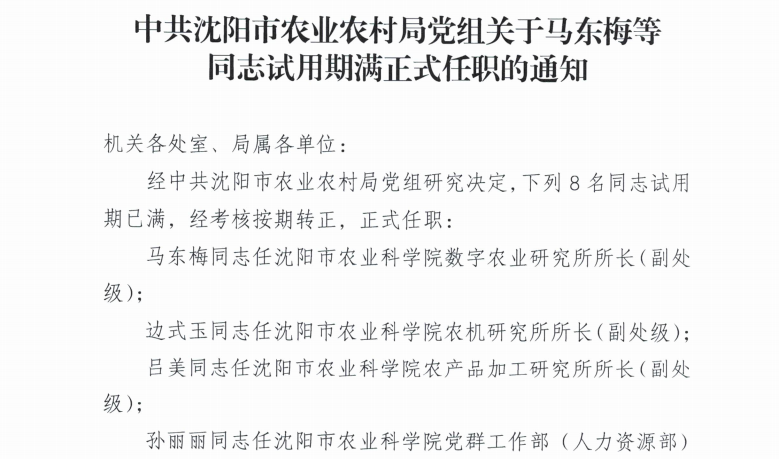 中共沈阳市农业农村局党组关于马东梅等同志试用期满正式任职的通知