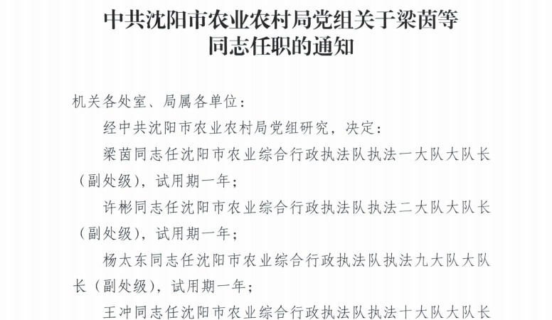 中共沈阳市农业农村局党组关于梁茵等同志任职的通知